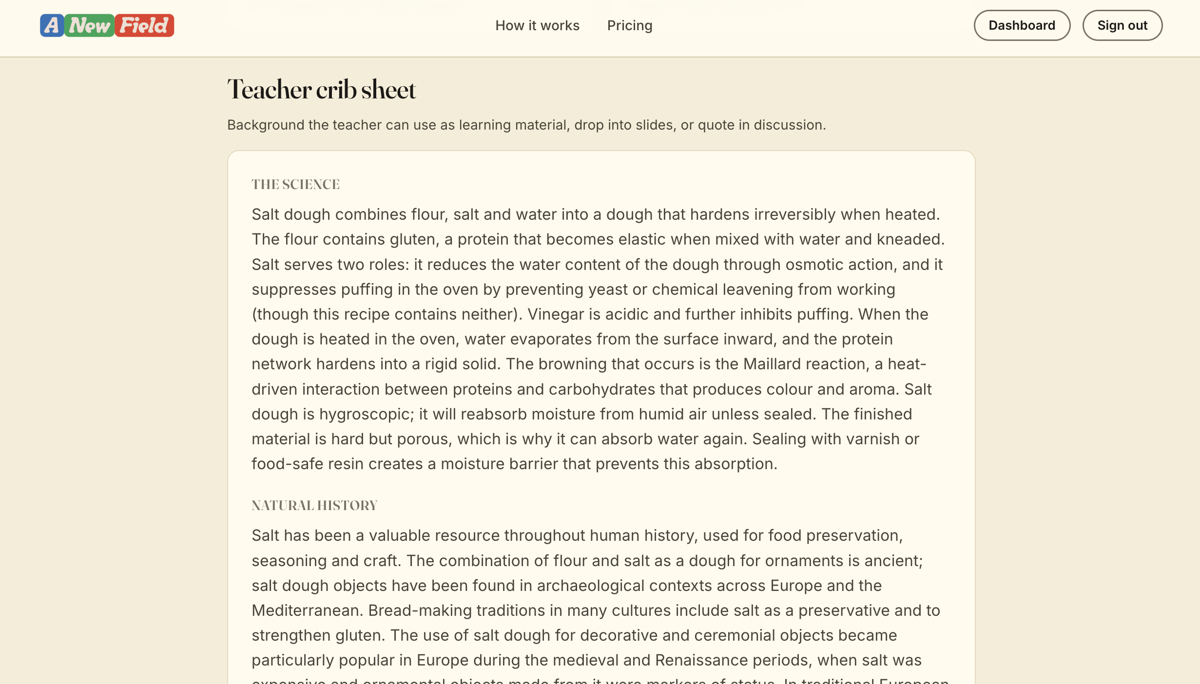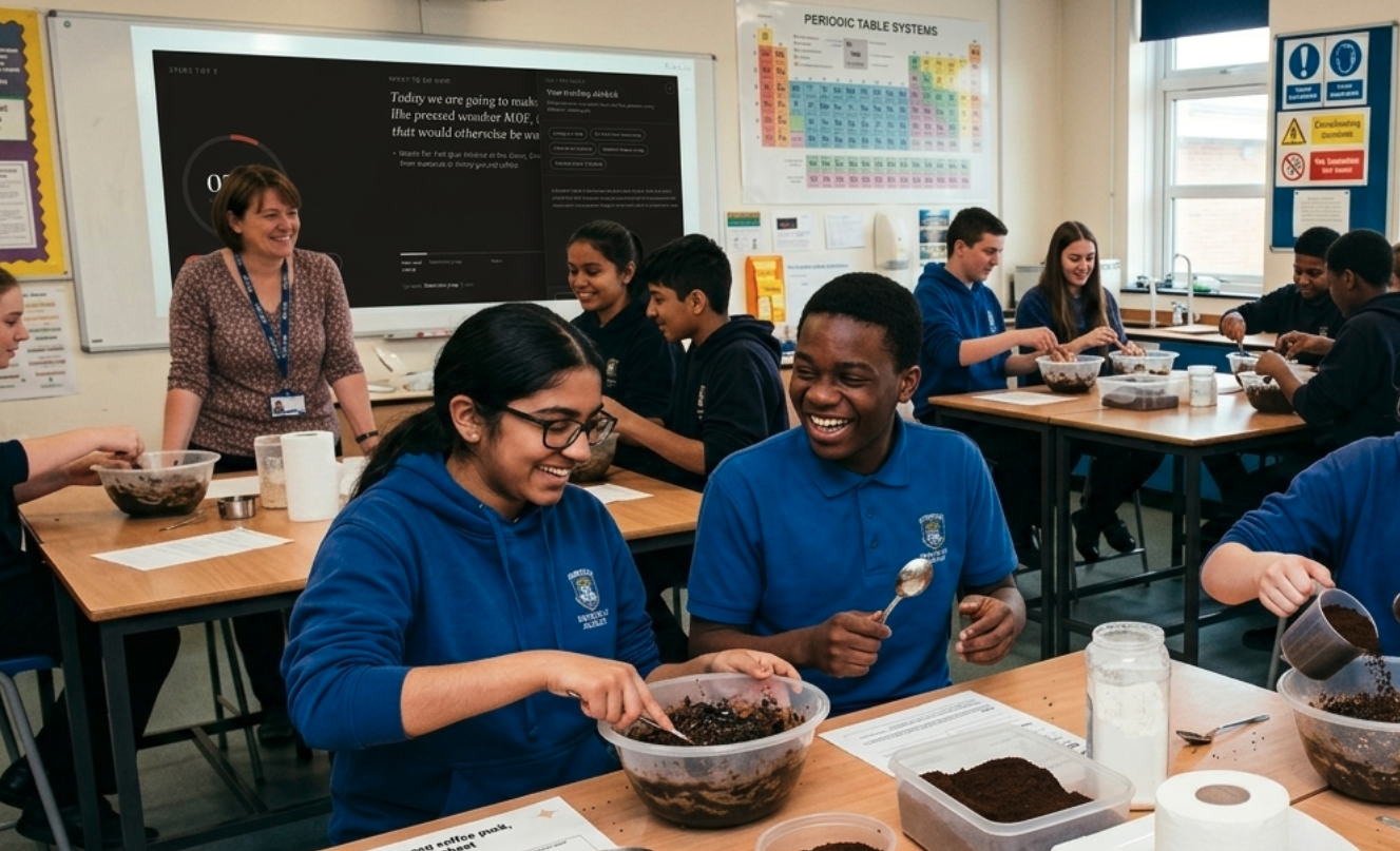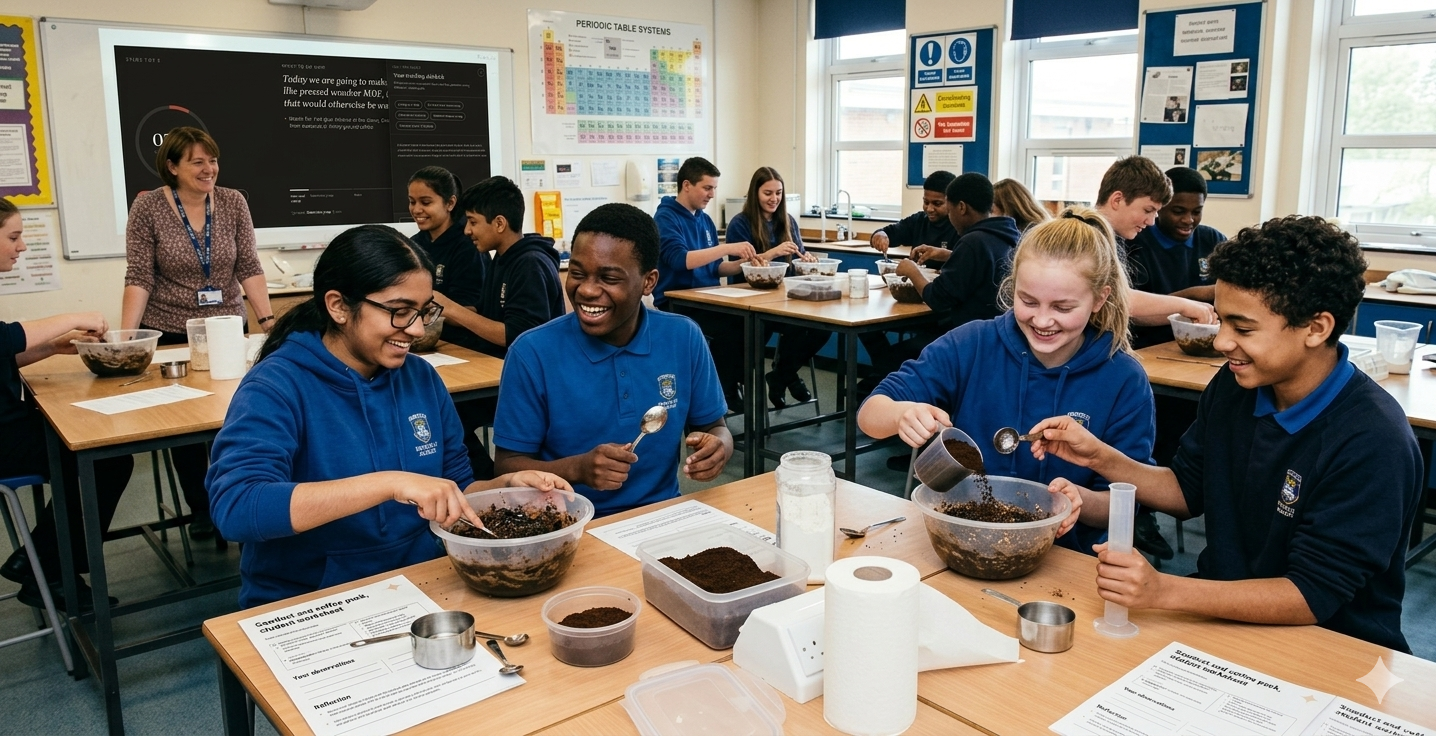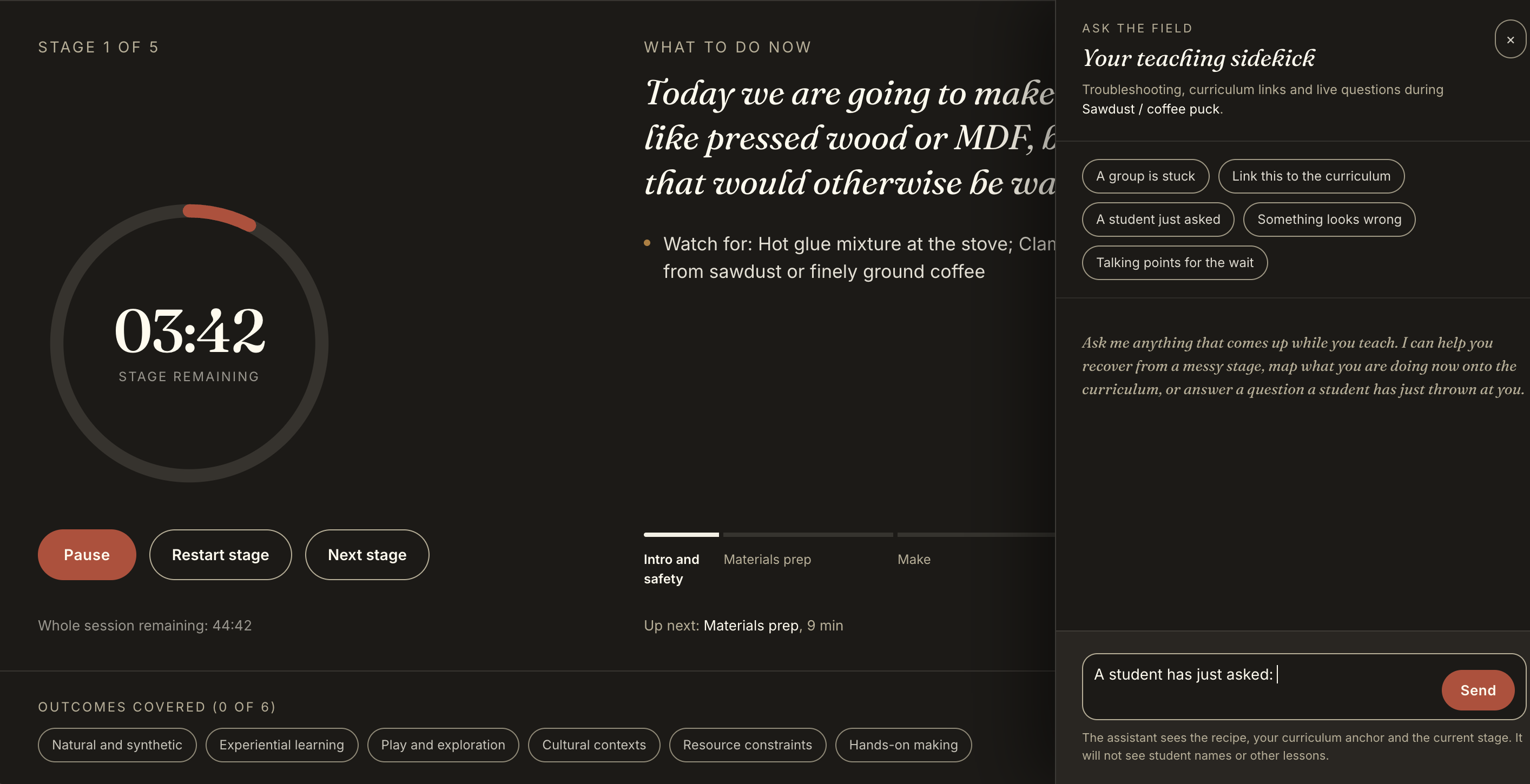 Dig deeper, recover from a messy stage, or respond to any question a student throws at you using our AI-enabled chat function. It is briefed on the recipe, your curriculum anchor and the stage you are in, so the help you get tends to land in the moment rather than after the bell.